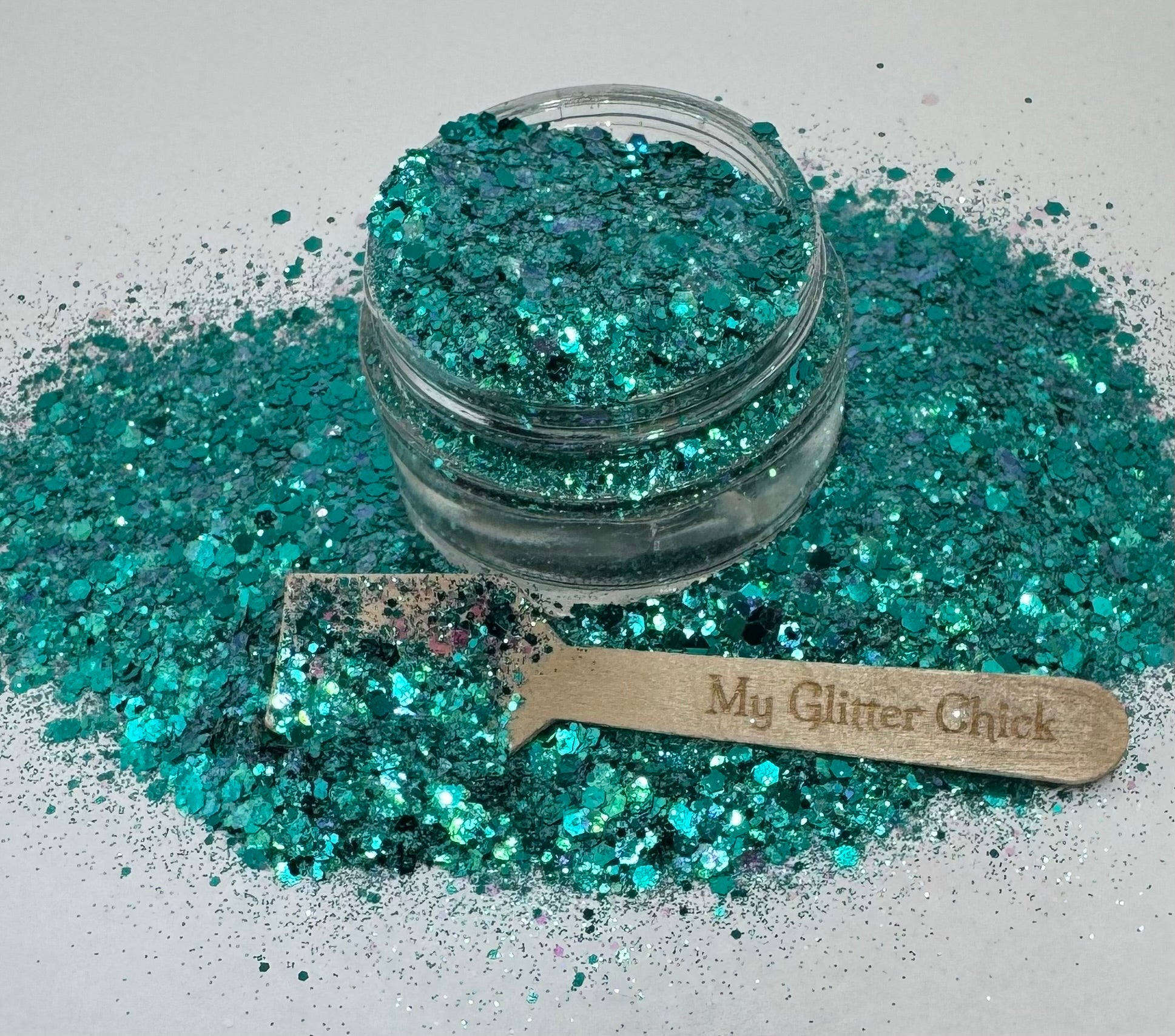 Flash Dance is a stunning teal chunky glitter mix, matching glitters White Wedding Chapel, Las Vegas Strip, and Viva Las Vegas, Part of the Vegas Party Pack bundle. A must have for your collection!