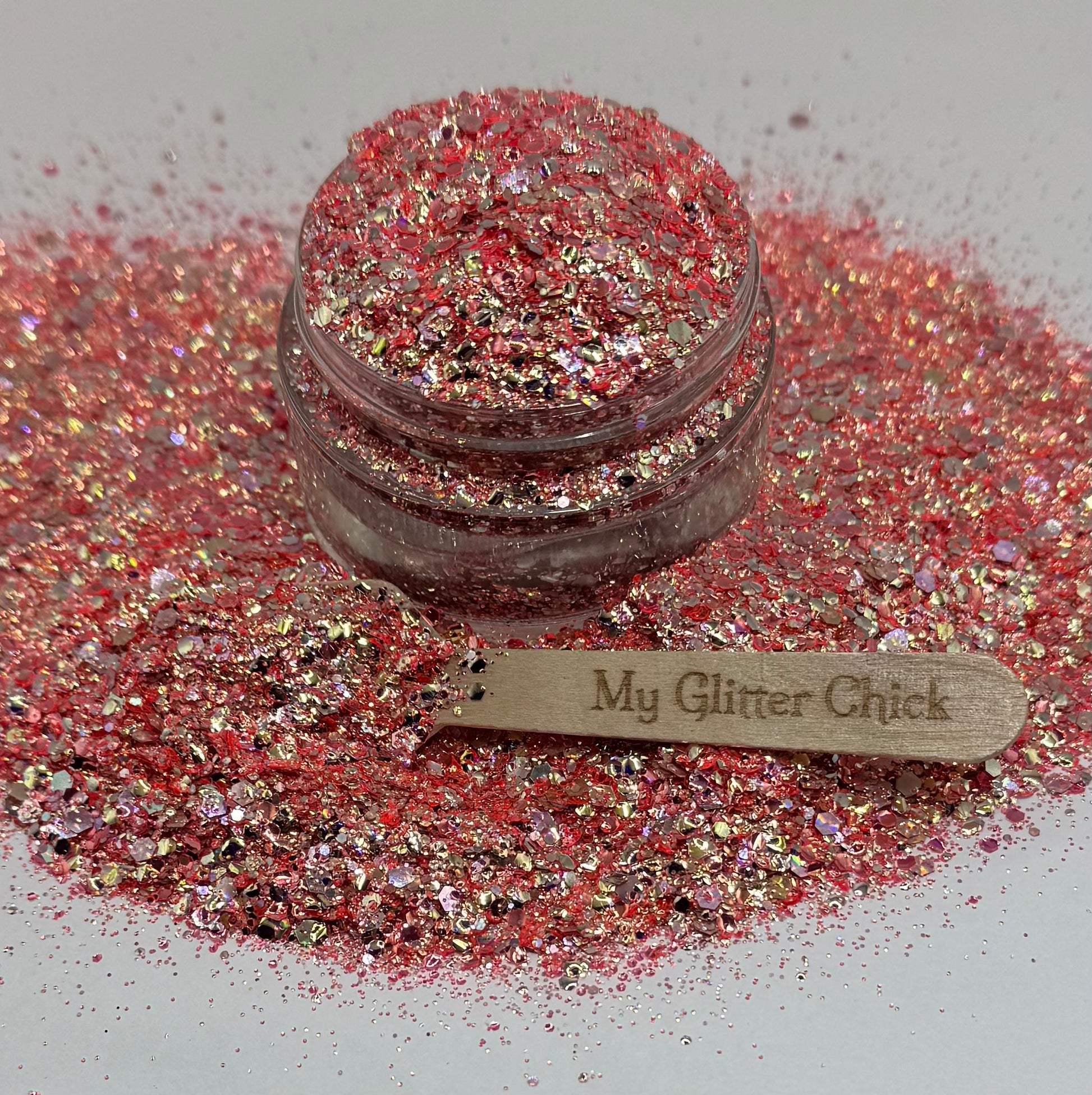 Strawberry Fizz is a Stunning chunky glitter mix, a must have for your collection! Similar Glitters, Seductive Spark (lighter Pink), Starlight Dust (darker Pink), and Enchantress Gleam